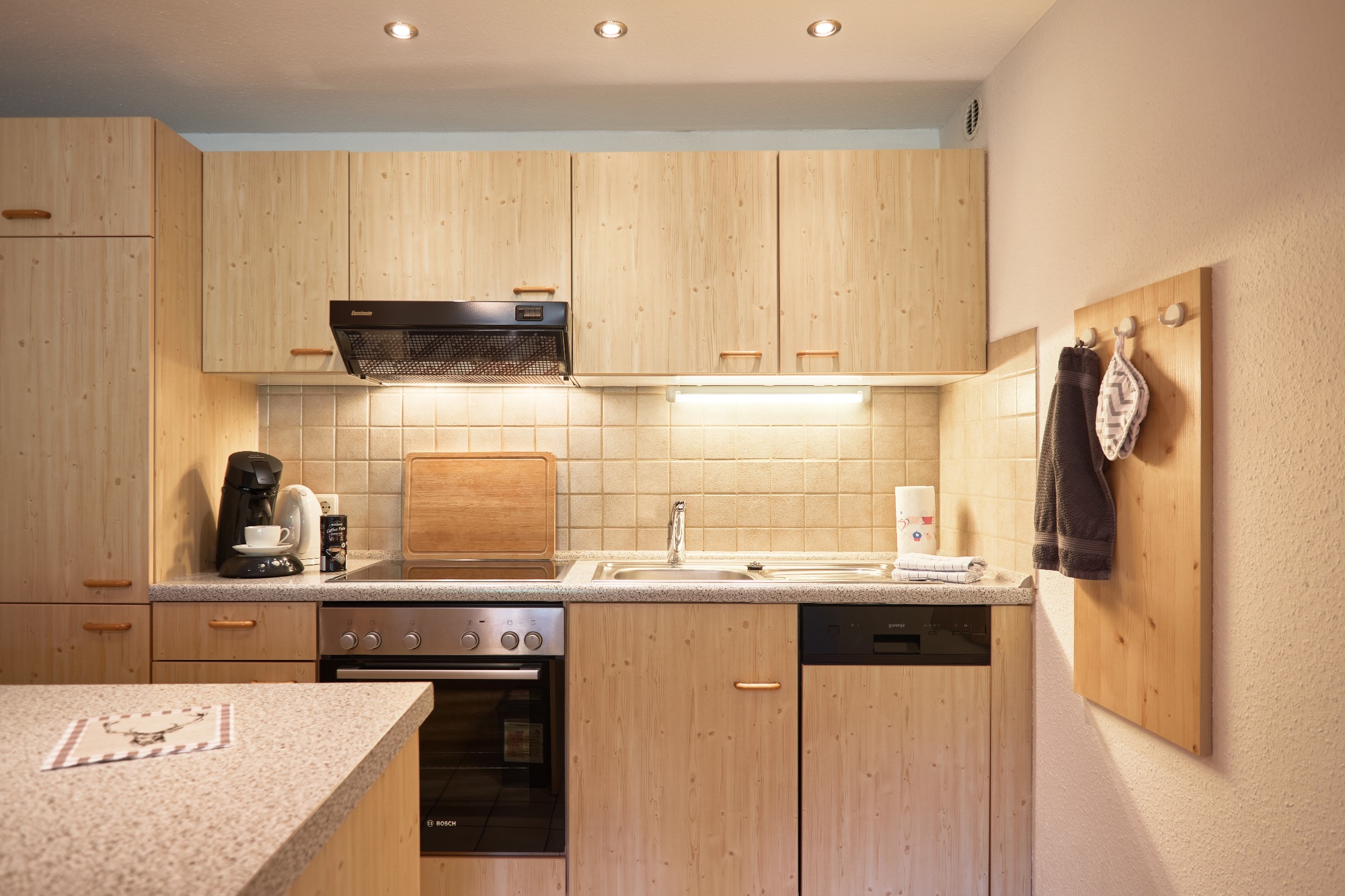 Sie verfügt über ein Schlafzimmer, ein Wohnschlafzimmer, eine voll ausgestattete Einbauküche und ein modernes Bad mit Dusche. Die sonnige Terrasse mit Blick auf Wald und Wiesen lädt zum Entspannen ein.